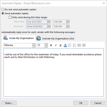 NOTE: If you want automatic replies to go to senders outside of the Fairway organization, select the Outside My Organization tab and follow the same steps.